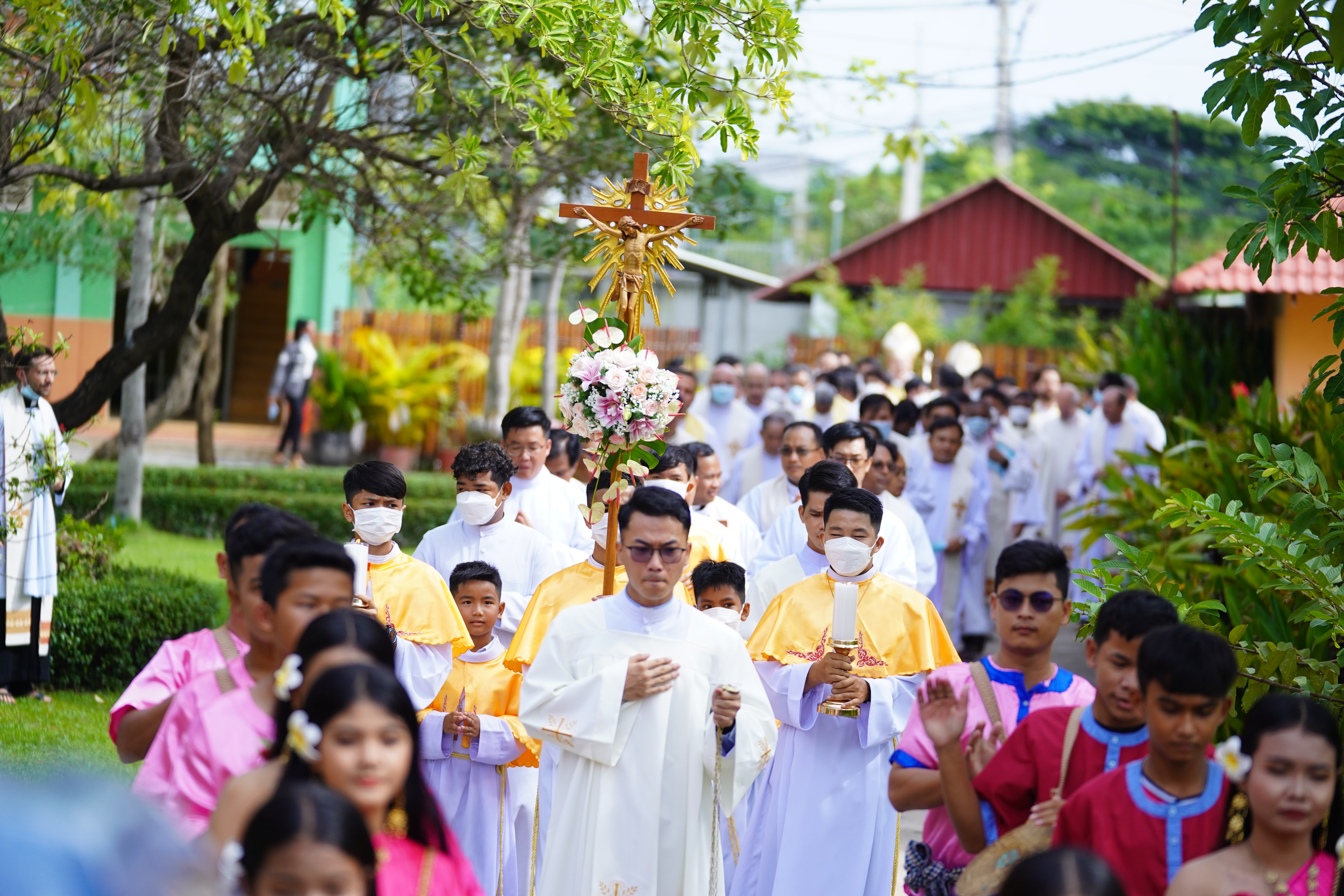 សំឡេងភ្លេងឆៃយ៉ាំលាន់កងរំពងយ៉ាងឱឡារិក មុខក្បួនដង្ហែយុវជនបីរូបជានិស្សិតទេវវិទ្យាល័យ សន្តយ៉ូហាន ម៉ារី វីយ៉ាណែរនាទីក្រុងភ្នំពេញ ដែលបានសុំថ្វាយខ្លួនទៅព្រះជាម្ចាស់ ដែលមានអមដោយមាតាបិតារបស់លោក និងអស់លោកបូជាចារ្យនិងលោកអភិបាលព្រះសហគមន៍កាតូលិកកម្ពុជាទាំង៣ភូមិភាគ ហែចូលក្នុងពិធីតែងតាំងជាឧបដ្ឋាក។