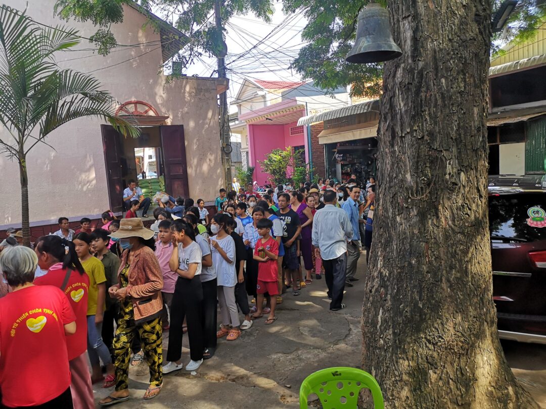 ជនក្រីក្រ៣៣០គ្រួសារ ទទួលគ្រឿងឧបភោគបរិភោគពីព្រះសហគមន៍កាតូលិកនិងព្រះសង្ឃខាងព្រះពុទ្ធសាសនា នៅព្រះវិហារសន្តហ្វ្រង់ស្វ័រសាវីយ៉េ (ព្រះសហគមន៍ចំប៉ា) នៅភូមិចំប៉ា ស្រុកកៀនស្វាយ ខេត្តកណ្ដាល។